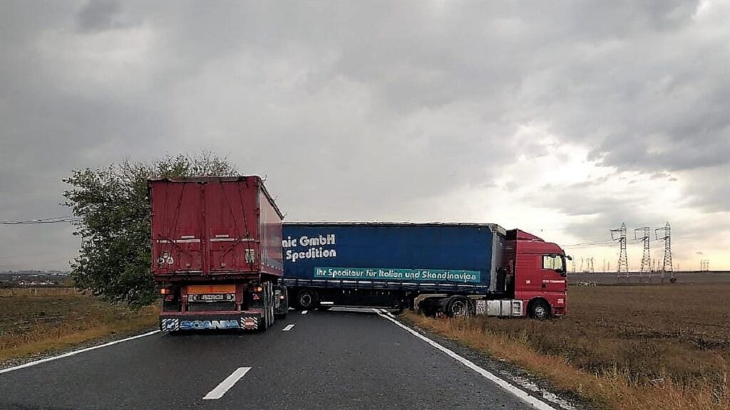 Circulația rutieră este oprită la această oră, pe DN 22, în localitatea Mihai Viteazu din județul Constanța, după ce un camion a derapat și a blocat șoseaua.