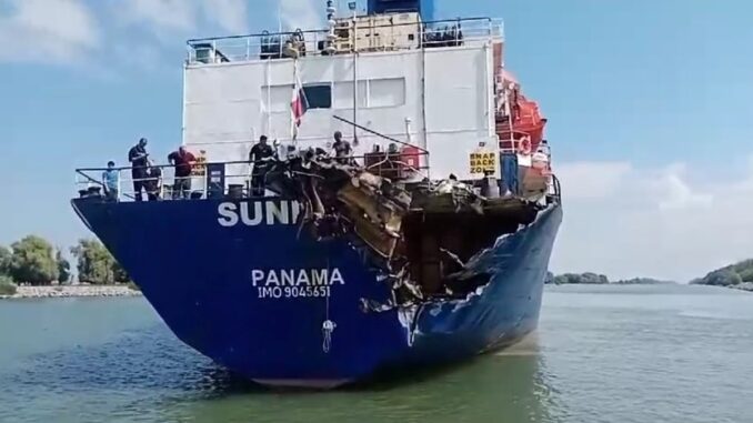 „Nava maritimă SUNDRY, sub pavilion Panama, naviga aval de la Izmail cu destinația Tunisia, având la bord o încărcătură de 6.228 de tone de orz. În timpul deplasării, nava a suferit o defecțiune la motorul principal, care a forțat echipajul să ancoreze în regim de urgență. În timpul manevrei, nava a fost lovită de tancul MAZU XIAO, sub pavilion Liberia, care naviga amonte de la Constanța către Izmail, transportând 6.620 de tone de motorină.
