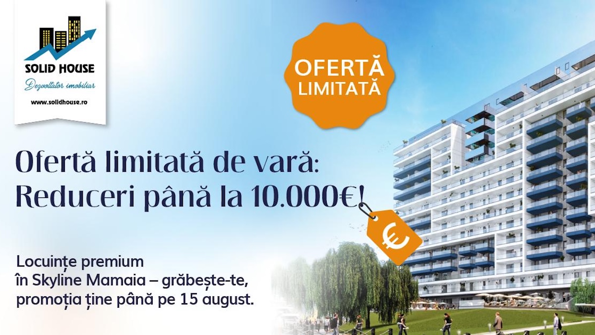 Solid House anunță lansarea campaniei estivale „Oferta Verii Skyline”, prin care oferă o reducere de până la 10.000 de euro pentru achiziția unui apartament în noul complex Solid Residence Skyline Mamaia. Promoția este disponibilă timp de 6 săptămâni, până la 15 august 2025, și se aplică tuturor rezervărilor, antecontractelor sau contractelor de vânzare semnate în această perioadă.